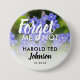 En knapp för vänner och familj till bära på en begravning med en bild av blått glömmer mig inte blommor med ord "GLÖM MIG INTE", som syftar på din älskade som har passerat med namn och dödens datum.