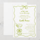 Vi presenterar den "Lilla en på väg" Funkiga och Whimsical Handritade Dirty Martini Bebis-fest Inbjudan i grönt och vitt – En trendig och lekfull inbjudan för att fira den blivande mamman! Med en snirklig ram med en charmig coquette-slöja, är denna design accentuerad med en handritad dirty martini med tre oliver i det nedre hörnet. Den rena vita bakgrunden låter kombinationen av handskriven skrift och funkiga blocktypsnitt lysa, och skapar en rolig men ändå elegant stämning. Perfekt för att sätta tonen för en oförglömlig bebisfest med vänner och familj. Anpassa enkelt denna mall med dina evenemangsuppgifter. Finns också som en omedelbar digital nedladdning för enkel delning