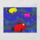 Funky tecknad fisk som simmar längs med en vågblå bakgrund och reflexbubblor