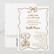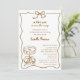 Vi presenterar den "Tini One on the Way" Funky och Whimsical Handritade Espresso Martini Baby Shower-inbjudan med QR-kod – En trendig och lekfull inbjudan för att fira den blivande mamman! Med en snirklig ram och en charmig coquettebåge, accentueras denna design med en handritad espresso martini i det nedre hörnet. Den rena vita bakgrunden låter kombinationen av handskriven skrift och funky blockfonter lysa, och skapar en rolig men ändå elegant stämning. Perfekt för att sätta tonen för en oförglömlig baby shower med vänner och familj. Gör det enkelt för vänner och familj att se din babyregistrering genom att uppdatera QR-koden på baksidan av inbjudan. Anpassa enkelt denna mall med