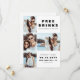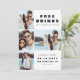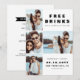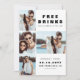 Ett modernt och lustigt "FREE DRINKS OCH A BRÖLLOP ON THE SIDE" 4-fotokollage bröllop spara datum-kort för att knäcka dina gäster. Utformningen har modern typografi i vit bakgrund. På kortets baksida har utformningen större anpassade.