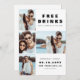 Ett modernt och lustigt "FREE DRINKS OCH A BRÖLLOP ON THE SIDE" 4-fotokollage bröllop spara datum-kort för att knäcka dina gäster. Utformningen har modern typografi i vit bakgrund. På kortets baksida har utformningen större anpassade.