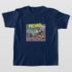 Two funny alley cat skaters on a personalized t-shirt. Use "Personalize this template" to change the name and make a unique, customized gift. Features a skateboarding tabby cat in board shorts and t-shirt, and an orange cat with spray cans drawing graffiti on the wall behind, already painted with catnip graffiti and cat skulls.