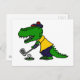 Lustigt alligator spelar golf och bär en röd och blå golfsockel och blå byxor och gult-skjorta i den här roligten originalkonsgolfdesign.