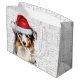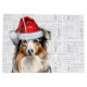 En tricolor Australian shepherd sitter med en söt röd julhatt för hund eller hund älskare av Aussie-rasen under julhelgen.