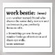 Work Bestie (Noun): En medarbetare blev vän som delar samma dagliga tortyr och förstår dig perfekt på grund av det. En vänskap som vuxit genom liknande irritationskänsla och rullar från öga. Se även: sanitetsinnehavare.