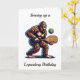 Lustigt födelsedagsslag och ett Sasquatch-spelkort. Tecknad Bigfoot håller ett redo för att upp en legendarisk födelsedag.