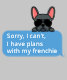 Den här roliga frenchie-tröjan har en söt blå fransk-bulldog med ett textmeddelande som lyder "Förlåt, jag kan inte, jag har planer med min frenchie". Den här söta tröjan finns också med olika franskar av färgad, både för män och kvinnor.