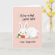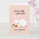 This card shows a plump white rabbit lounging on its belly against a soft pastel pink background, giving the scene a cozy, affectionate mood 🌷. The rabbit’s long ears frame its face, with pale pink inner fur, closed eyes, and rosy cheeks that suggest a bashful grin, like it’s sharing a private joke with someone close. Nestled in its front paws is an orange carrot with leafy green tops, adding a bright contrast that feels like a sweet offering 🐰. Near the top, casual hand-lettered text in a dark tone reads “i’ll hop on that carrot later,” setting up a flirty, teasing beat. Below the rabbit, a smaller line of matching text says “i mean, happy easter,” like a quick, sheepish correction after getting carried away. The spacing keeps the rabbit centered as the main focus, with the top line arcing lightly above and the second line sitting comfortably underneath. Gentle shading beneath the rabbit gives it a soft grounded look on the pink field. The carrot’s green leaves fan upward in three small tufts above the orange body.