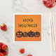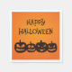 Napkins visar fyra pumpor i rad och "Happy halloween" i nödlidande typsnitt ovan. Bakgrunden är orange och det andra inslag är svart. Lustigt, coola och jack o lantern. En produkt i en Halloween fest-svit.