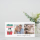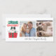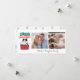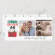 Holiday design features a funny cat inside a present, getting into mischief. It's a meowy Christmas! To the right of the cat personalize card with 2 photos and change default text with your own family name. On the back minimalist watercolor pine trees fill the card.