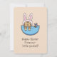 Lustigt Cat i Bunny Costume med en liten mus i en fickillustration av Påsk Greeting Card med lustig Påsk text: "Hoppy Påsk från vår lilla ficka!"