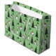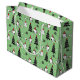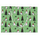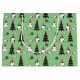 Funny Christmas illustration of cats in Santa hats, with little mice, fish and yarn around Christmas trees. All-over print pattern on a green background.