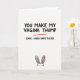 This card features a crisp white background with a big, hand-drawn style line of black text centered near the top, written with cheeky confidence as if it’s teasing someone close. One key word in that top line is singled out with a bright red underline, pulling your attention the way a flirty nudge might. Just below, a smaller second line of black text shifts into a more traditional holiday greeting, creating a funny contrast that feels like an inside joke between friends. The layout stays minimal so the message feels direct, like a note passed across a table with a knowing look. Near the bottom edge, a small springtime bunny 🐰 peeks up into the space, adding a sweet counterpoint to the daring wording. Its simple dark eyes and rounded face give it an innocent, affectionate expression, as if it’s in on the joke but still trying to look polite. The only soft color is the gentle pink inside its ears 🌷, set against the black lettering and that single red underline. The bunny sits centered at the bottom margin, with its ears rising into the white space beneath the text.