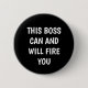 Visa roligten med den här knappen Funny Chef Humor. Det är designat med ett lustigt ordspråk: "detta chef kan och kommer att avskeda dig" i fet vit, enkel text på svart bakgrund. Perfekt liten presentidé för chef dag.