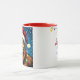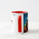 A funny Sasquatch personalized Christmas coffee mug with a comic book style pop art sasquatch smiling with a Santa and Christmas lights on.