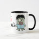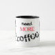 Mugg kommer att ge ett leende. Bilden är av en tecknad zombie med galet ögon och ett muntorrt blod. Texten i mitten i rött och svart säger "Behöver mer kaffe". zombiebilden skrivs ut på två sidor. Cute!