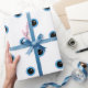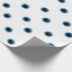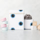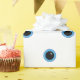 Kläppig söt tecknad-stil blå ögonboll som slår in papper roligt för födelsedagsfester med halloween och monstertema. Dubblor som ett ondskefullt öga motiv att avundas födelsedagspresent. Redigera om du vill ändra den vita bakgrunden till valfri färg. ♡ Idyllfire