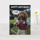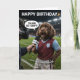 Funny football birthday card featuring a dog in a post-match interview with a VAR joke.