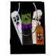Mellanliggande Storleka Party Gift Bag med Funny Frankenstein, Ghost, Ovisible Man och Pumpkin-teckningsbild. FabricSeal på Zazzle är ett stort tillägg i vår Halloween-samling med fyra Halloween-favoriter i fläkt. Denna roligt av glass i stick figur animerad tecknade figurer är i firande som Halloween är varje dag. Frankenstein rymde från sitt slott i Genève, Schweiz. Ghoulish Ghost med sängtäcket lakan och läskigt peekaboo ögon. Den osynliga människan är utplåad och inlindad i bra. Jack o lantern Pumpkin är redo för att tända den Happy halloween-spirerade glöden hela värld runt. Färg paletttoner av svart, vit, grått, grått, tan, beige, brun, orange, lila, grönt, rosa och rött färger. Kolla in all vår underbara konstdesign och alla våra produkter i vår butik. Tack 👻 🧛 🦹 budgivningsbud Tack för att du besöker och handlar på vår butik TheFabricSeal. Följ oss på Zazzle och Pinterest. #ZazzleMade