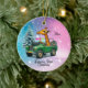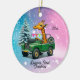 Denna Julgran-prydnad har en viskgiraffe som driver en grönt Land Rover, försedd med en krans för julen och en färgstark flagga på ram, mot en blå och rosa snöbakgrund och mot en snö-täckt gräs träd i bakgrunden. Det kan vara personlig genom att lägga till ett baby namn och födelsedatum.