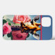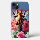 Lustigt telefonfodral har lustigt giraffe porträtt med stor rosa ros och blå bakgrund. Digital målning skapat med AI-genererande software.