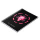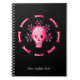 En snygg bärbar dator med en digital illustration som skildrar en rosa skalle med ögonfransar som tittar förbryllad med en lycklig mask som kommer ut ur dess öga-socket, blommor som ligger bakom den och ben runt den och anpassade text. Underbar för Halloween och gothic stil med en känsla av humor.