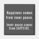Kökets roliga och moderna grått- och vita magnet definierar vad och var lycka och inre verkligen kom kommer ifrån. Texten lyder: Lycka kommer från inre fred. Innerfreden kommer från koffein.