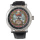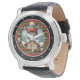 A whimsical Christmas illustration featuring a cheerful donkey wearing a red and green winter hat, holding a sign that reads "HAE-HAW HEE-HAW HOLIDAY!". The donkey is surrounded by a festive wreath of pinecones, holly, and silver ornaments, set against a red plaid background. The artwork is presented on a round, silver-toned item with numerical markings around its edge, capturing a fun and lighthearted holiday spirit.