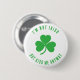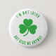 A simple, funny button for non-Irish people who enjoy Saint Patrick's Day, with a green shamrock in the center and arched message, also in green, around it: "I'm not Irish" above it and " but kiss me anyway" below it. The background is white.