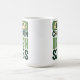 This modern typographic "May Contain Irish Sass" mug features a playful "warning label" aesthetic, complete with two caution triangles at the top flanking the word "MAY". The bold, blocky lettering uses a stylish palette of forest, sage, and kelly green, accented with a shamrock icon.