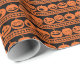 Funny jack o lanterns on wrapping paper for Halloween. Featuring a motley crew of carved pumpkins and jack o lanterns, grinning, scowling and gurning. The pumpkins are arranged in stripes, with a smaller stripe of pumpkin leaves dividing them. The spooky pattern is pumpkin orange on a pitch black background.