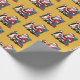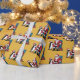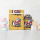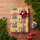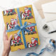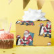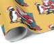 En rolig juldesign av en Jultomten med gult bakgrund. Jultomten är sitta i en stol med en käpp. Det finns en penguin bredvid honom. Pingviner har också en Jultomten-hatt. Den totala bilden har en vintage stil.