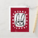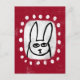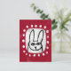 En söt dragen kanin i svart och vitt över en röd texturerad bakgrund omgiven av vita prickar.
