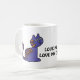 En tecknad med söt blått och orange rand finns på båda sidor om mugg. Den svarta texten i mitten säger Kärlek, kärlek min katt! *Den här designen användor bild © Graphics Factory.com*