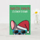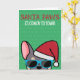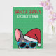 Om man känner någon som kärlek fransk bulldog och som har en bra känsla av humor, så är detta roliga frenchie-julkort idealiskt att skicka till dem under festen helgdag. Utformningen har en illustration i tecknad-stil av av en lera och brun fransk bulldog med röd tomhatt och solglasögon med texten "Santa Tass kommer" till färgaden" skriven på framsidan. På insidan står det: "Vill du ha en grym jul", men kan ändras till din belåtenhet. Denna utformning finns också tillgänglig med olika tjurar för fransk av färgad.