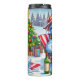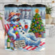 Denna humoristiska illustration visar en smälter snögubbe-avslappning i en strandstol med en glasruta av vin. Snögubbe bär solglasögon och en regnbåge med en skylt bredvid den som säger: "JAG HAR EN MELTDOWN... PASSA VIN." En dekorerad Julgran och gåvor är i snöbakgrunden och fångar upp en lustig och relativ helgdag.