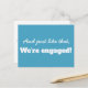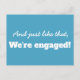 En lustig minimal typografisk design i blått och vitt med en textparsning i coolan som säger: Och precis så är vi förlovade! med en textmall på baksidan så att du kan lägga till anpassningsbarna i matchande blått och vitt färg inverterat. #savethedate