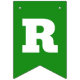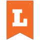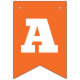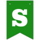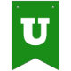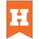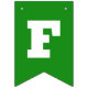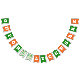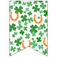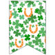 Orange and green St Patrick's Day bunting flags spelling out Oh For Luck's Sake with bold letters, and two flags with a four leaf clover and horseshoe pattern.