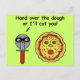 Det här fåniget, den humoristiska pudexen visar en pizzakare som säger till en skrämt tecknad pizza: "Hand över degen, annars skär jag dig!" Pizzaköraren bär en svart mask som en muggare och pizzan skapar ett skrämt ansikte i form av en rund pepperoni-mun, oliv ögon och en svampnäsa. Gröntens bakgrund färg är anpassade.