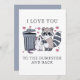 Funny Valentine's Day flat card with a cute design of a raccoon and a rat illustration, and the message "I love you to the dumpster and back". All text is editable, and on the back, there's space to add a message or leave it blank to handwrite it.