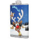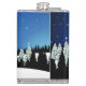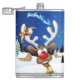 A Funny cartoon reindeer with a bright red nose and large white antlers, adorned with a red and gold bow, peeks through an open window. Outside, a snowy landscape with silhouetted pine trees and a small, glowing house is visible under a dark blue, star-filled night sky. Santa's sleigh pulled by reindeer is flying in the distance. The scene evokes a festive and whimsical Christmas atmosphere. Original Vector Art Copyright BluedarkArt TheChameleonArt.
