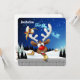 A Funny cartoon reindeer with a bright red nose and large white antlers, adorned with a red and gold bow, peeks through an open window. Outside, a snowy landscape with silhouetted pine trees and a small, glowing house is visible under a dark blue, star-filled night sky. Santa's sleigh pulled by reindeer is flying in the distance. The scene evokes a festive and whimsical Christmas atmosphere. Original Vector Art Copyright BluedarkArt TheChameleonArt.