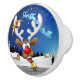 A Funny cartoon reindeer with a bright red nose and large white antlers, adorned with a red and gold bow, peeks through an open window. Outside, a snowy landscape with silhouetted pine trees and a small, glowing house is visible under a dark blue, star-filled night sky. Santa's sleigh pulled by reindeer is flying in the distance. The scene evokes a festive and whimsical Christmas atmosphere. Original Vector Art Copyright BluedarkArt TheChameleonArt.