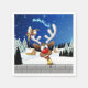 A Funny cartoon reindeer with a bright red nose and large white antlers, adorned with a red and gold bow, peeks through an open window. Outside, a snowy landscape with silhouetted pine trees and a small, glowing house is visible under a dark blue, star-filled night sky. Santa's sleigh pulled by reindeer is flying in the distance. The scene evokes a festive and whimsical Christmas atmosphere. Original Vector Art Copyright BluedarkArt TheChameleonArt.