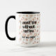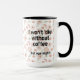 Den här söt svarta och pastel rosa blommigt mugg verkar oskyldig tills du läser frasen: "Jag kommer inte att dö utan kaffe, men det kan du." Jag gillar sammanstötningen av blommönstret för mjuk rosa med det svarta inslag & grunge-sprejade ord. Som hon... skaka och söt på utsidan, med en lastbilschaufför i munnen! Det skulle ge en underbar gåva till mamma på mors dag, eller till dam som desperat behöver sitt kaffe för att börja på dagen. Du kan mycket enkelt anpassa och ändra frasen om du vill.