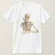 Lustigt leende skelett med sin beniga hand vilande på sin hacka.