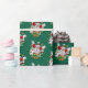 A funny snowman cartoon on Christmas wrapping paper. It's maximum Christmas with this excited snowman dressed up as Santa Claus, jumping out of a Christmas present like a jack-in-the-box. The surprise gift is wrapped in gold paisley wrapping paper and a green ribbon with white snowflakes.