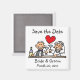 Spara datum magneter med en söt tecknad brud och groom! Anpassa med namn på briden och trimningen och bröllop-datumet i det utrymme som tillhandahålls.