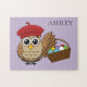 En illustration av en söt tecknad uggla med en röd fransk och med en brun fullt basket av färgstarka pastellpåskägg mönster. Denna underbara, roliga fågeldesign är en presentidé för påskägget jaga älskare och djur älskare. Anpassa eller anpassa det här pusslet genom att lägga till din egen text.